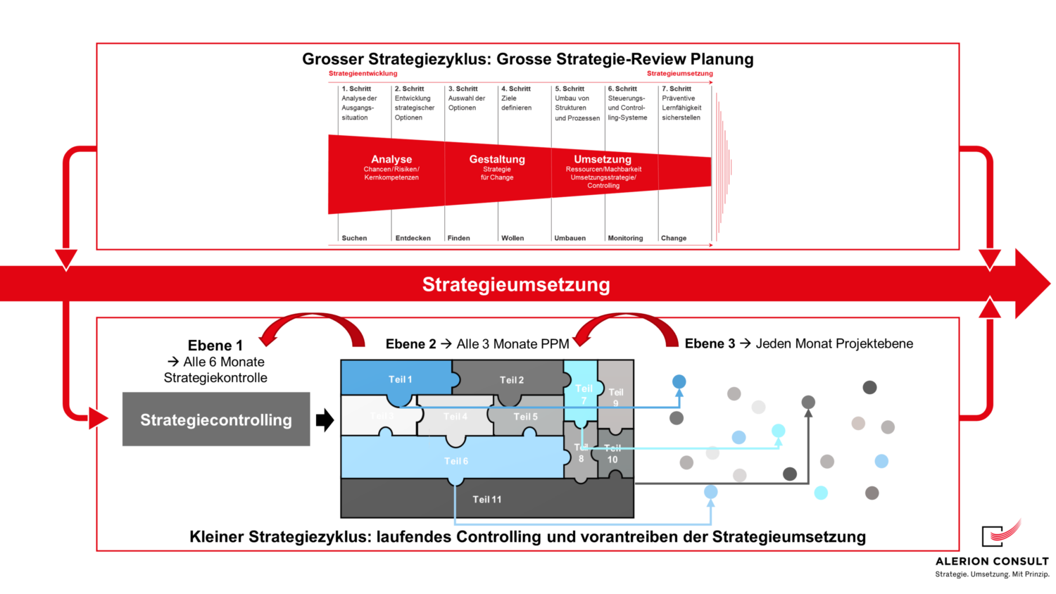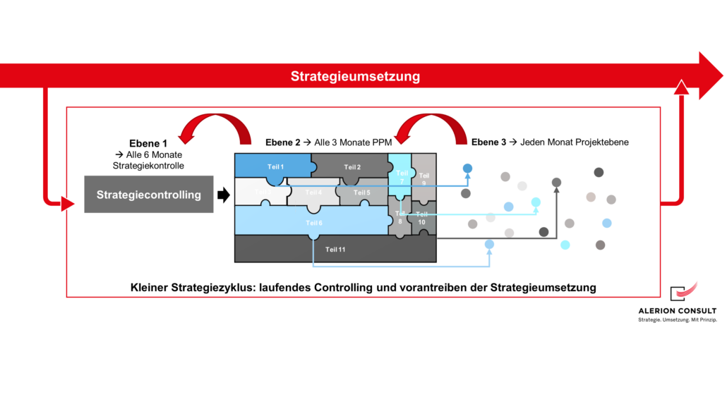 Die Umsetzung der Strategie ist ein Prozess, der das ganze Unternehmen tangieren kann. Um den Überblick über diesen Prozess nicht zu verlieren, die Ziele zu erreichen und die Strategieumsetzung voranzutreiben, ist ein entsprechendes, laufendes Controlling notwendig. Andernfalls besteht die Gefahr, dass die Strategie nur lückenhaft umgesetzt wird.